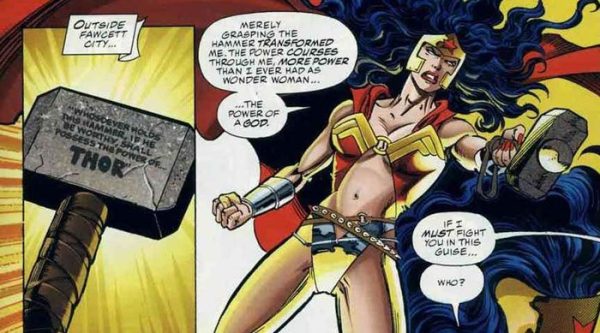 Se tem uma coisa que estamos acostumados é a rixa entre os fãs da Marvel e da DC, mas na década de 90 as duas empresas fizeram uma série de crossoverscolocando seus personagens mais famosos em batalhas, uma delas aconteceu entre Mulher Maravilha e Tempestade em Marvel vs. DC #2 em 1996. A amazona da DC sente um grande poder ao levantar o Mjolnir, mas Tempestade não recua mesmo assim. Durante a luta, Mulher Maravilha deixa o martelo cair e após muita porrada ela perde a luta. Dessa vez a vitória foi para o lado da Marvel.
