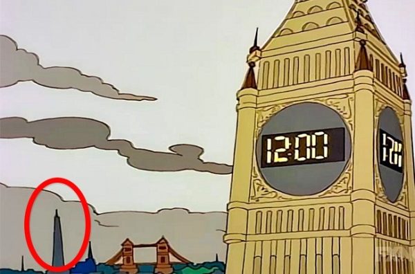 Na temporada 6, capítulo 19 exibido em 1995, Lisa faz uma viagem para Londres. Ao lado da Ponte da Torre aparece um edifício muito parecido com o prédio "The Shard". O único problema é que o prédio só foi construído 14 anos depois. Mas uma vez, coincidência ou uma previsão real?